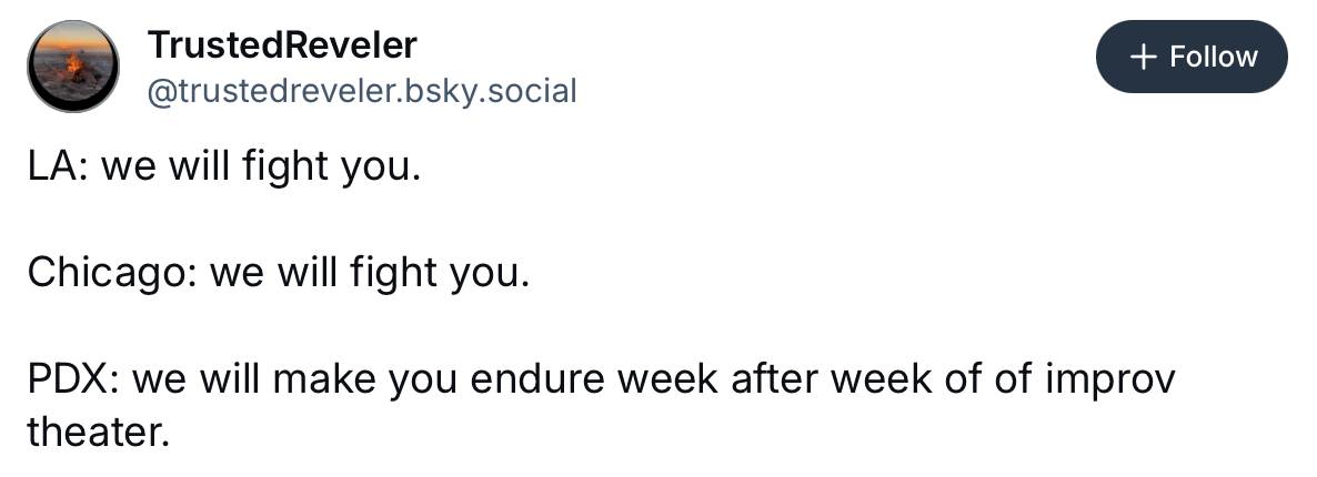 I’m thinking about this a lot today, not just because the memes are incredible and the actual social impact in terms of movement morale genuinely amazing, but because the idea of leaning into frivolity in a political moment determined to break our collective spirit seems like it should be obvious…but somehow takes tremendous effort. I happen to live with two of the goofiest, funniest kids on the face of the planet (not that I’m biased, but, needs must) but meeting their determined daily silliness with attention and presence and laughter is hard these days — and feels like it’s getting harder day after day.