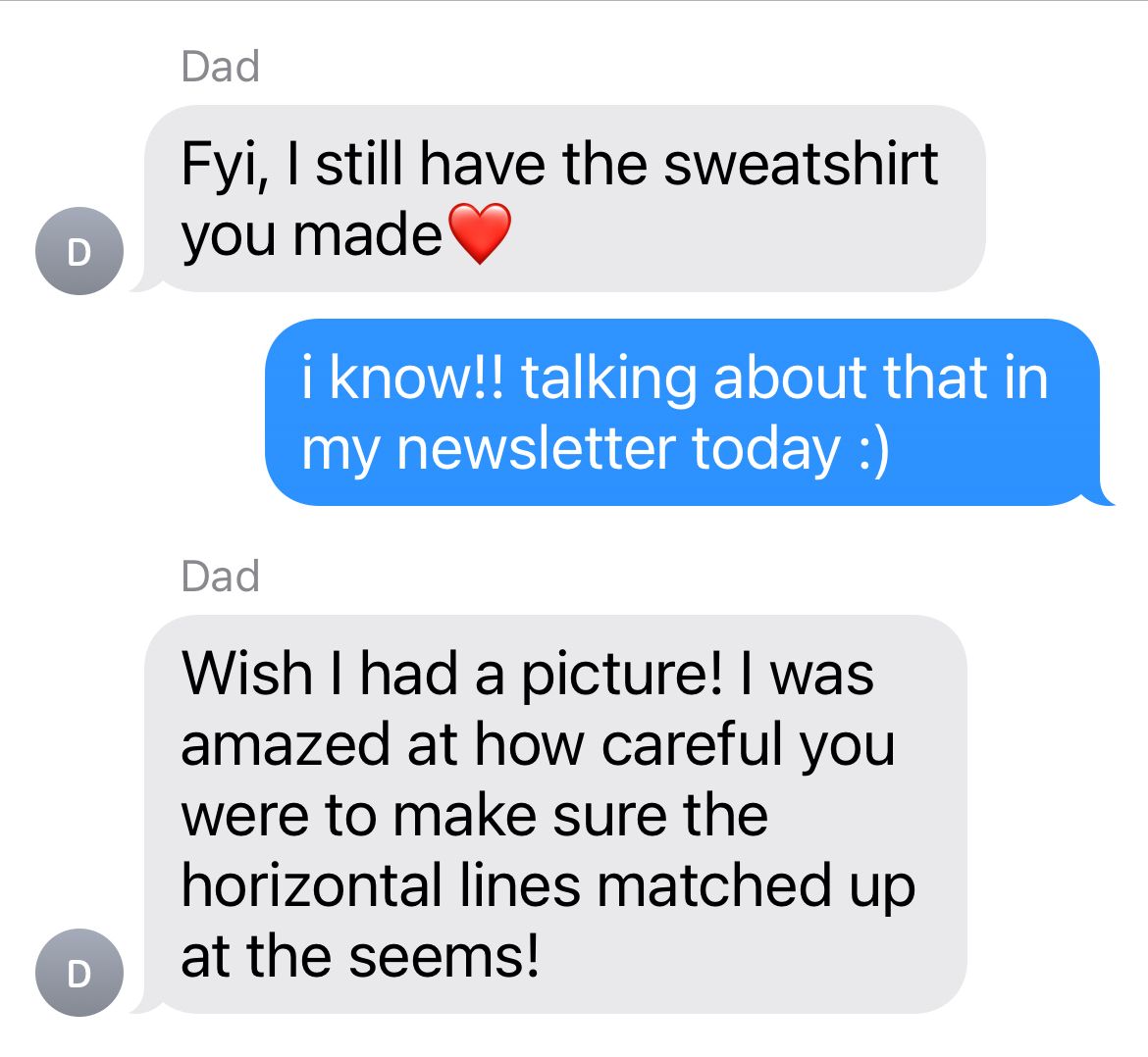 It was the first time I’d ever made something for someone that wasn’t an elementary school art project, and I was so, so proud of myself when I was done. My dad was delighted. And that sweatshirt held up — fifteen years later, he still wears it.